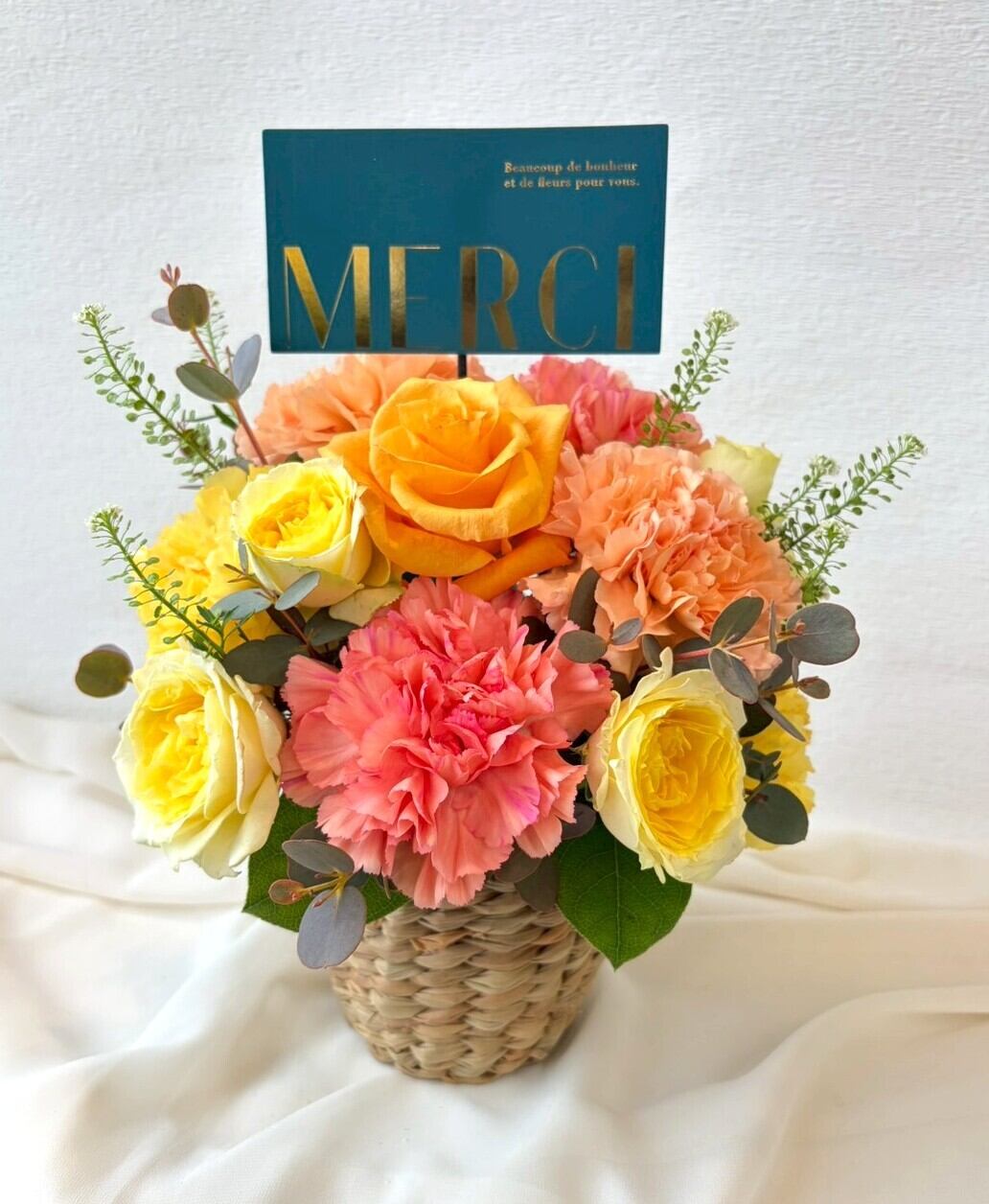 2026年花工房オリジナル母の日スペシャルアレンジメントです。明るく鮮やかなビタミンカラーは見る人の心を元気にしてくれます!オレンジのカーネーションの花言葉は「純粋な愛」などがあります。いつも忙しいお母様へ愛が伝わりますように。おしゃれで高級感のあるゴールド箔押しのカードピック付きです。こちらは母の日商品の為、4月20日からの配送となります。