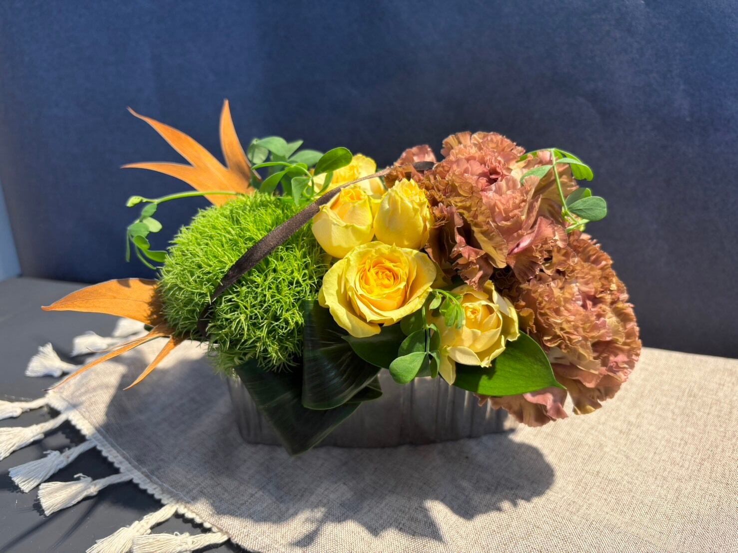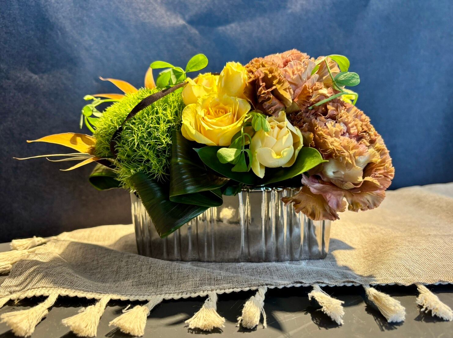 シルバーの器とシックな花合わせが魅力の大人なアレンジメント。落ち着いた華やかさで、上質な父の日のギフトに。