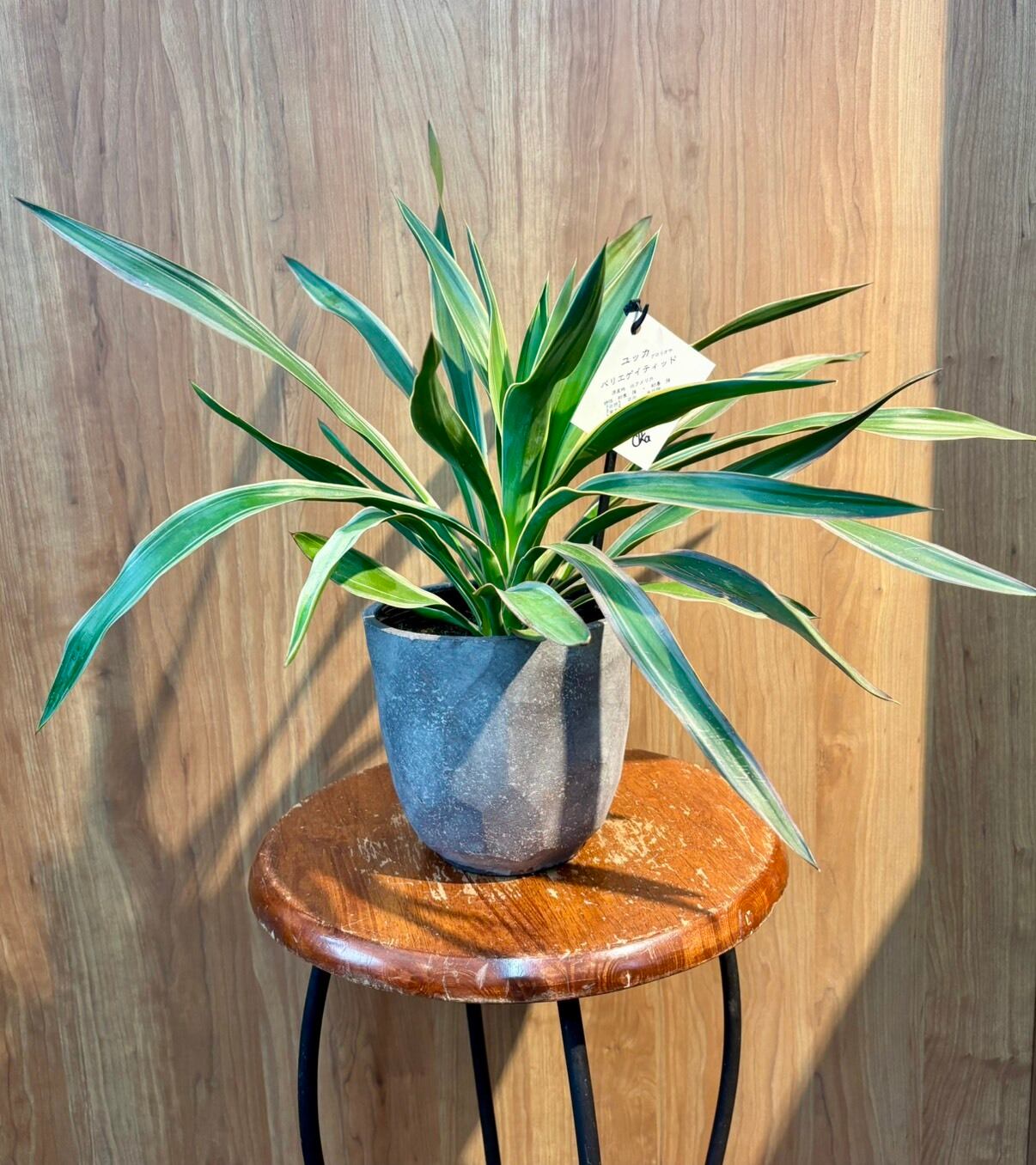 スタイリッシュな鉢と合わせた、存在感のおあるユッカはお手入れもしやすく