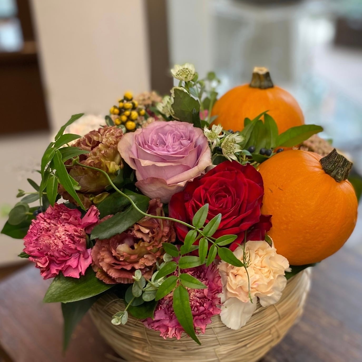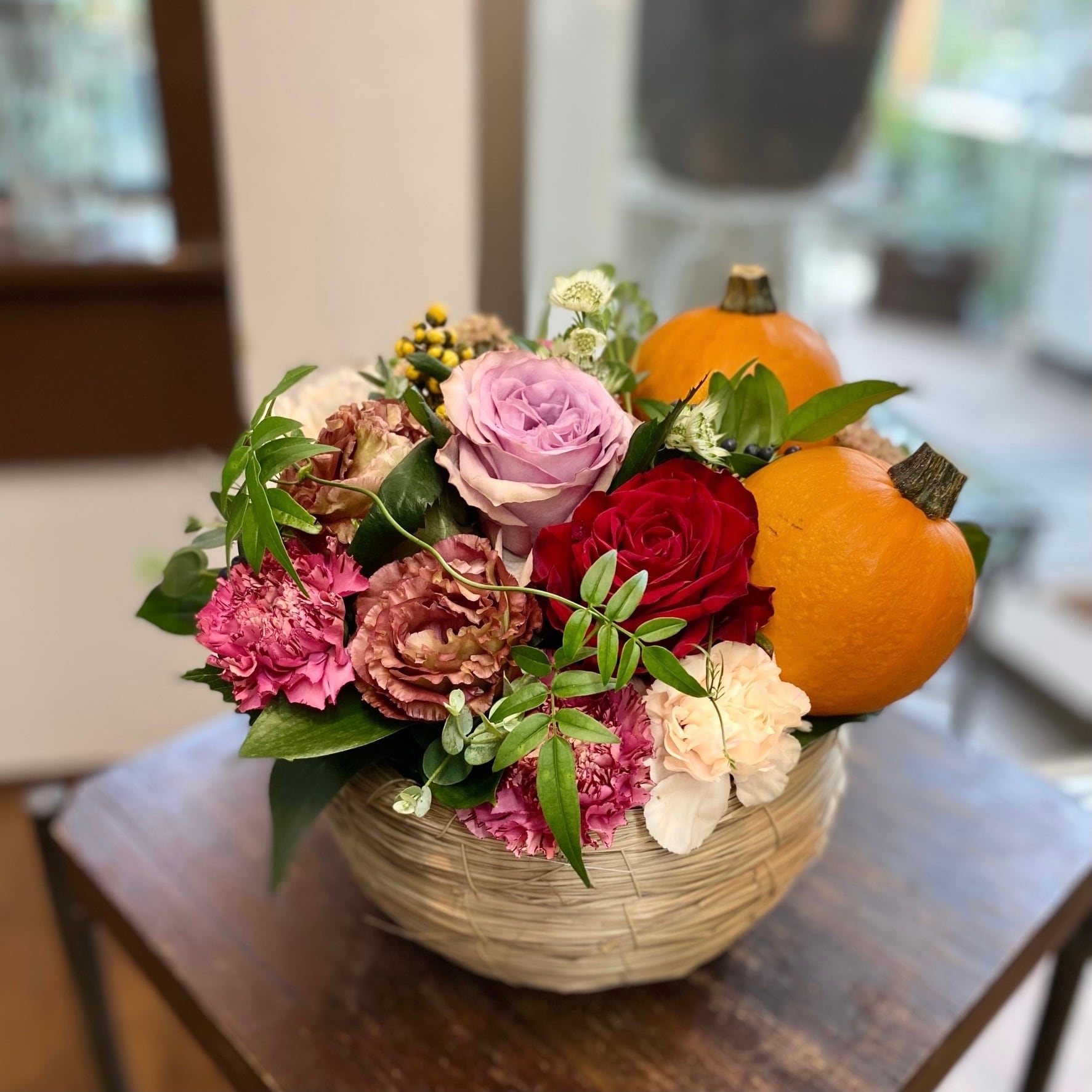 ハロウィンを楽しめるかぼちゃ入りのアレンジメントです。お部屋で風物詩を楽しみましょう。